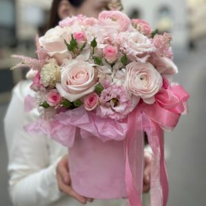 Flower Box Spring Joy z jaskrami, różami Pink O’Hara i ostróżką