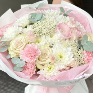 Bukiet Pastella z jasnych goździków, róż, i eustom