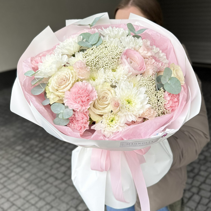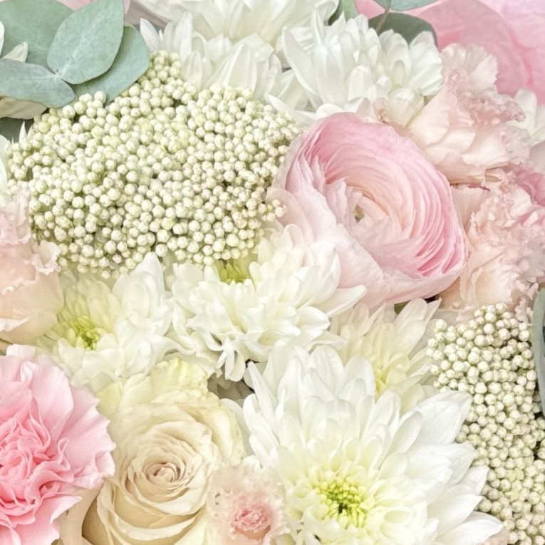 | Kwiaty w bukiecie | Eucaliptus Cinarea, Goździk, Margarytka, Ozothamnus, Ranunculus, Róża |